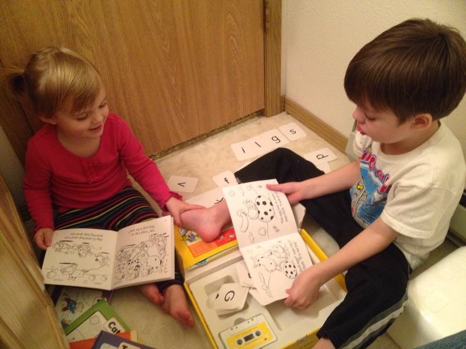 And this is what happens when I shower. I'd lock the door, but if there's an emergency, I want them to be able to get to me. At least they're doing school work.